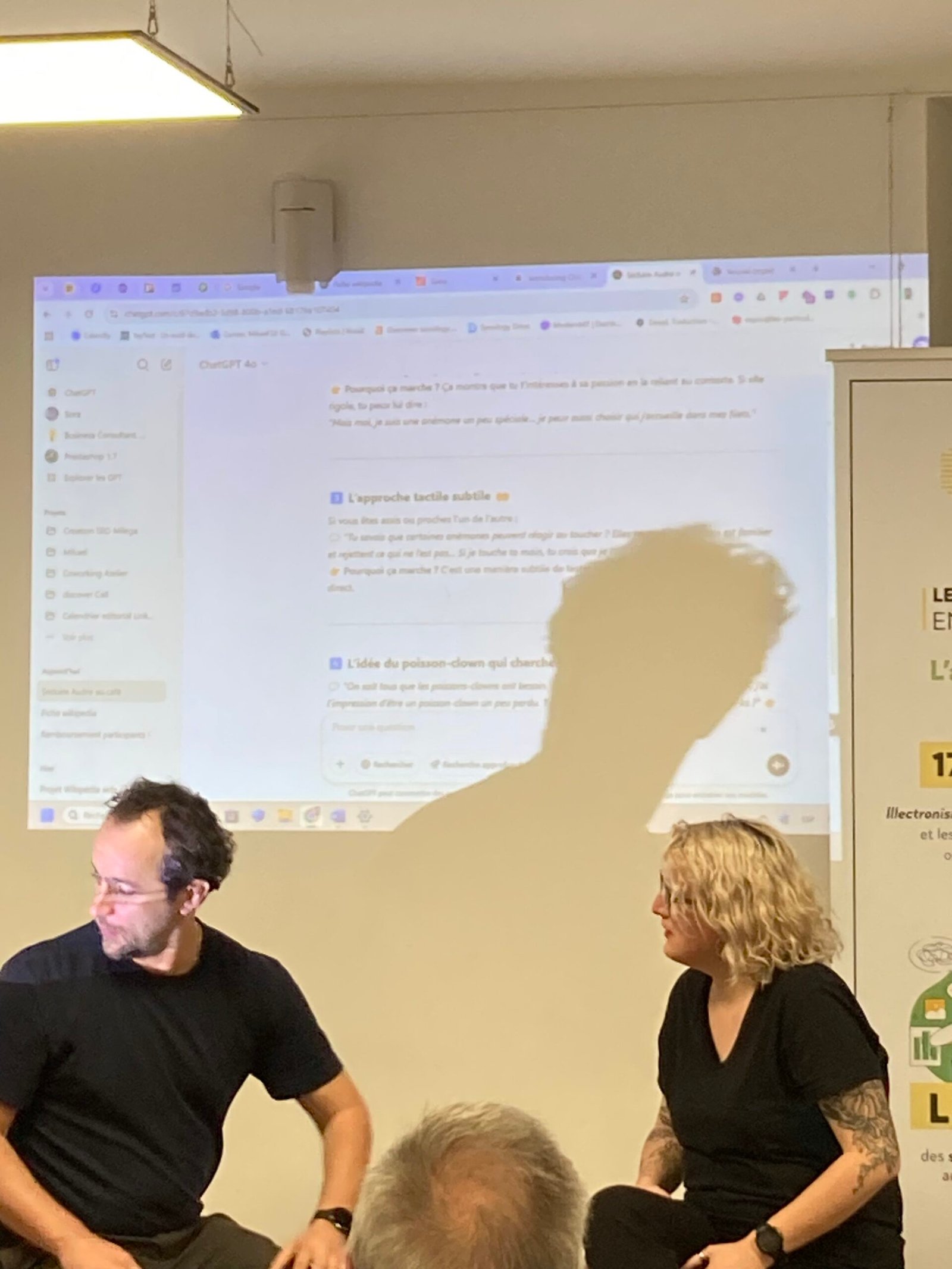 À partir d’un nom, prénom, lieu de naissance et métier inventés par le public, Audrey et Claude (une IA jouée comme un équivalent scénique de ChatGPT) ont coécrit en alternance une fiche Wikipédia fictive. Résultat : Jacques Fotré, diplomate interplanétaire, responsable de la plus grande coupure d’électricité interstellaire… Un moment aussi hilarant qu’éclairant sur la crédibilité donnée aux IA génératives.
